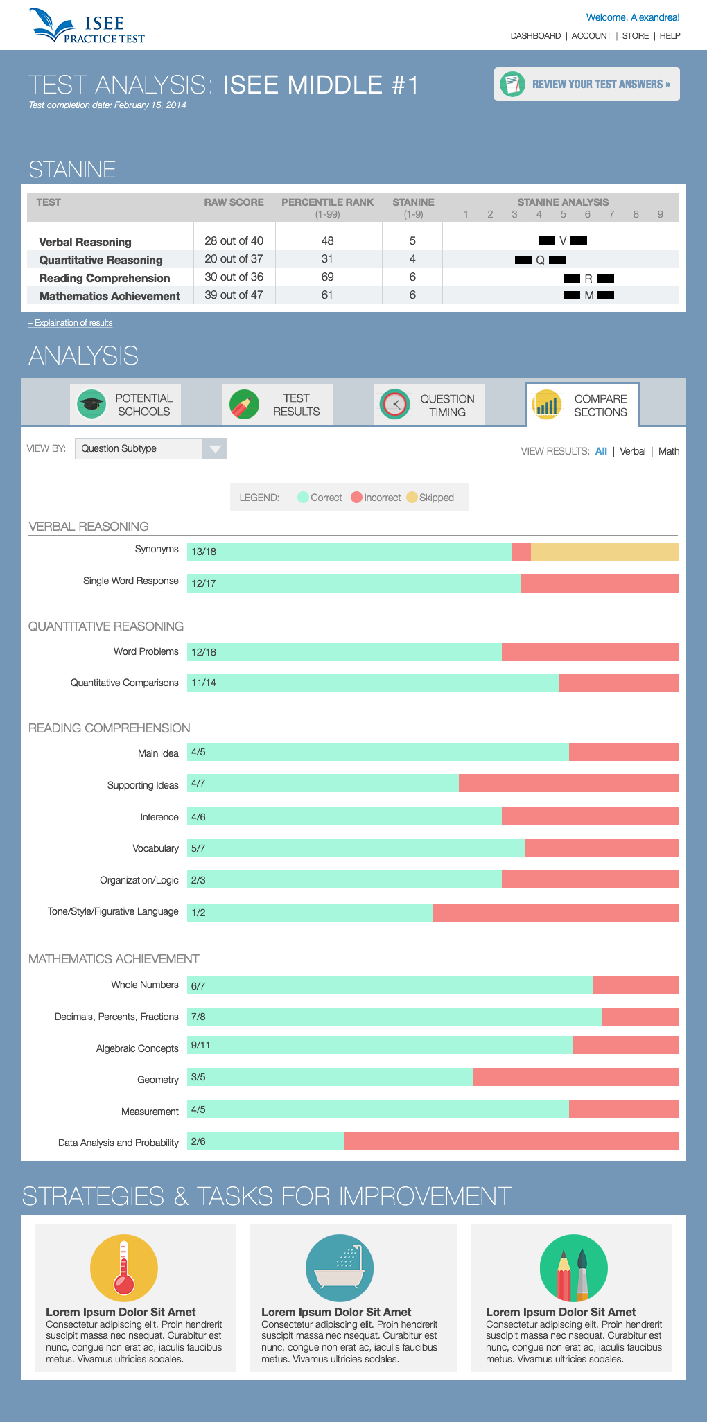 These next five images show what the site looks like. This is the dashboard we contributed to where the user sees their stanine scores, percentage in each section, and their raw score. There is a variety of other information for the user to browse through as well.